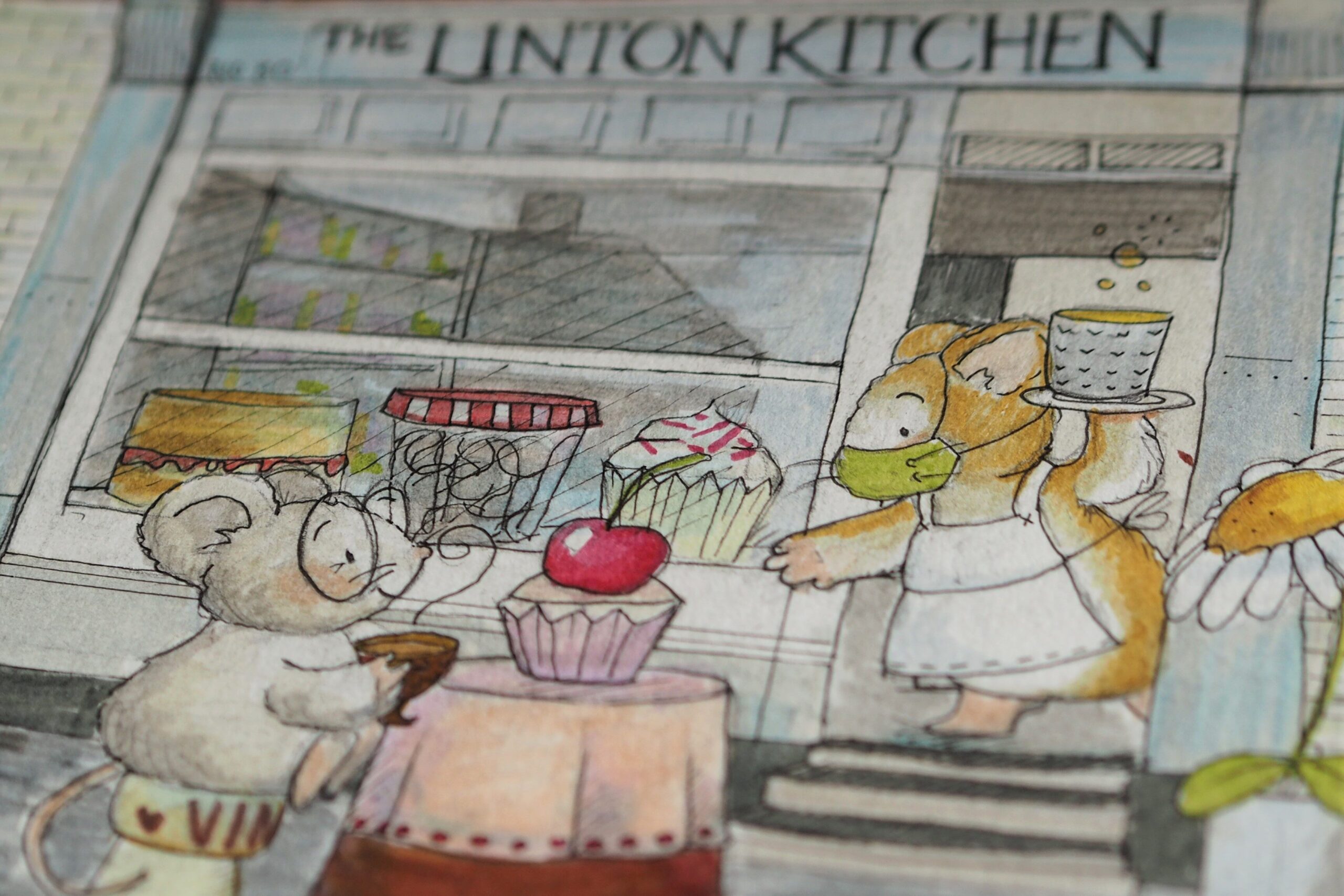 Sweet and characterful illustration of two mice at at the Linton Kitchen, now prominently displayed on their wall.